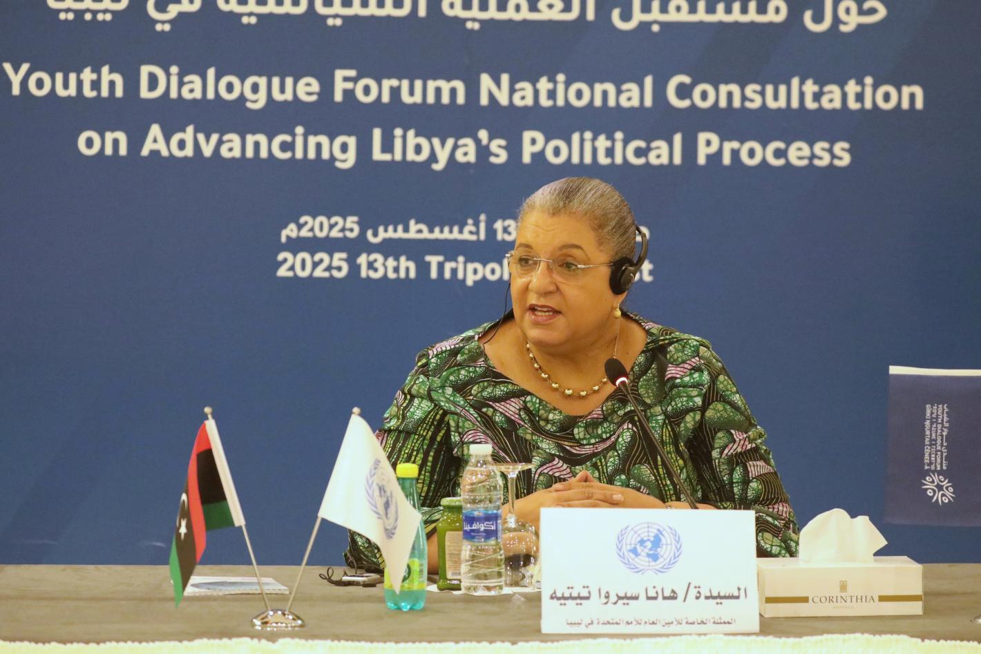 15 آب 2025UNSMILالممثلة الخاصة للأمين العام هانا تيتيه، تشارك في اجتماع لمنتدى حوار الشباب لمناقشة العملية السياسية مع شباب من مختلف مناطق ليبيا.