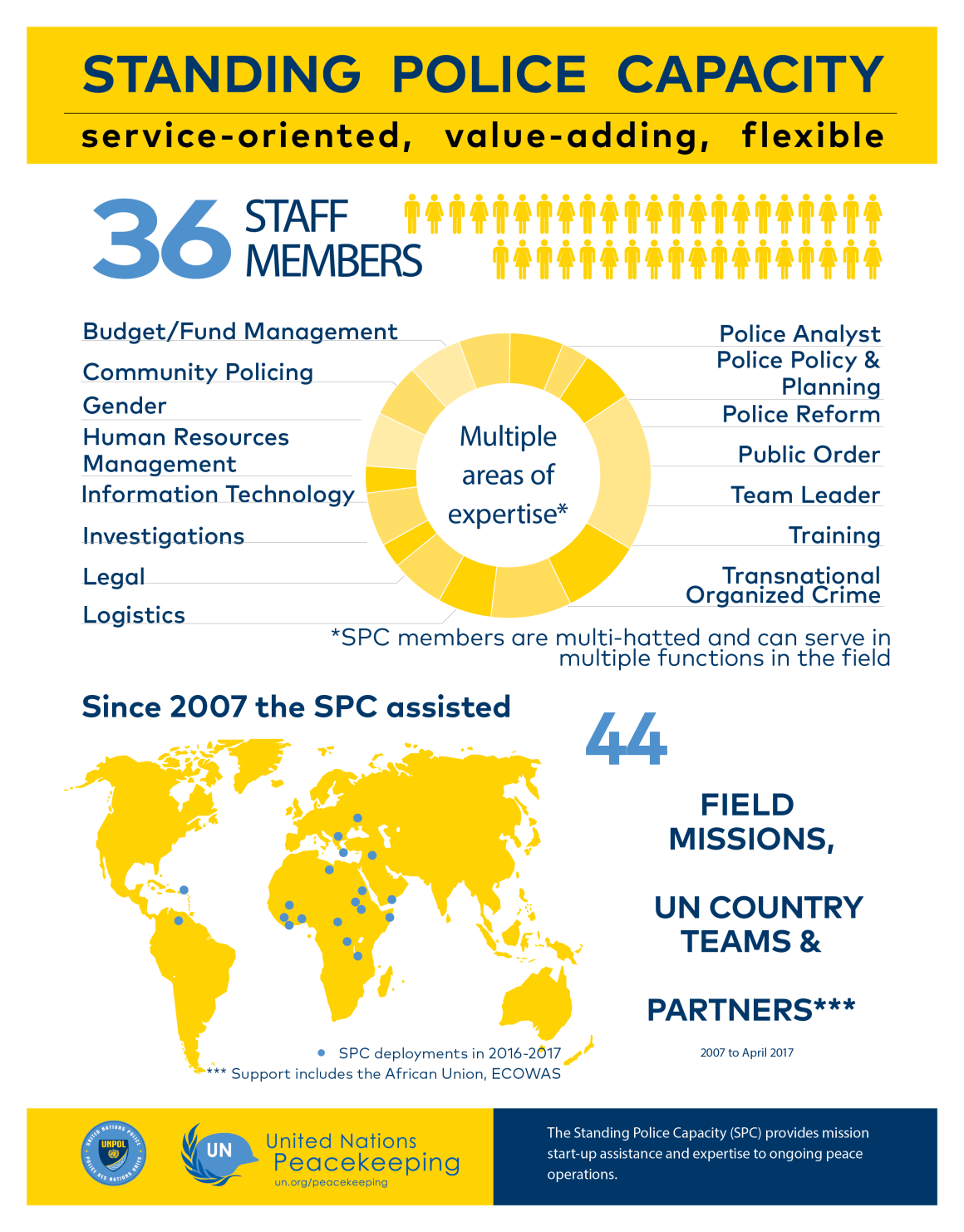 يوفر 36 SPC ضابطا مع المعرفة والخبرة المتخصصة ، بما في ذلك إصلاح الشرطة وإعادة الهيكلة والنظام العام والجريمة المنظمة عبر الوطنية ، والشرطة المجتمعية ، والشؤون القانونية ، والتحليل ، والتدريب ، والتخطيط ، والخدمات اللوجستية ، والميزانية وإدارة الأموال والموارد البشرية والمعلومات والاتصالات التكنولوجيا والتحقيقات والخدمات الاستشارية الجنسانية. عند نشرها ، يمكن لموظفي SPC أن يعملوا في وظائف متعددة الأطياف من أجل: