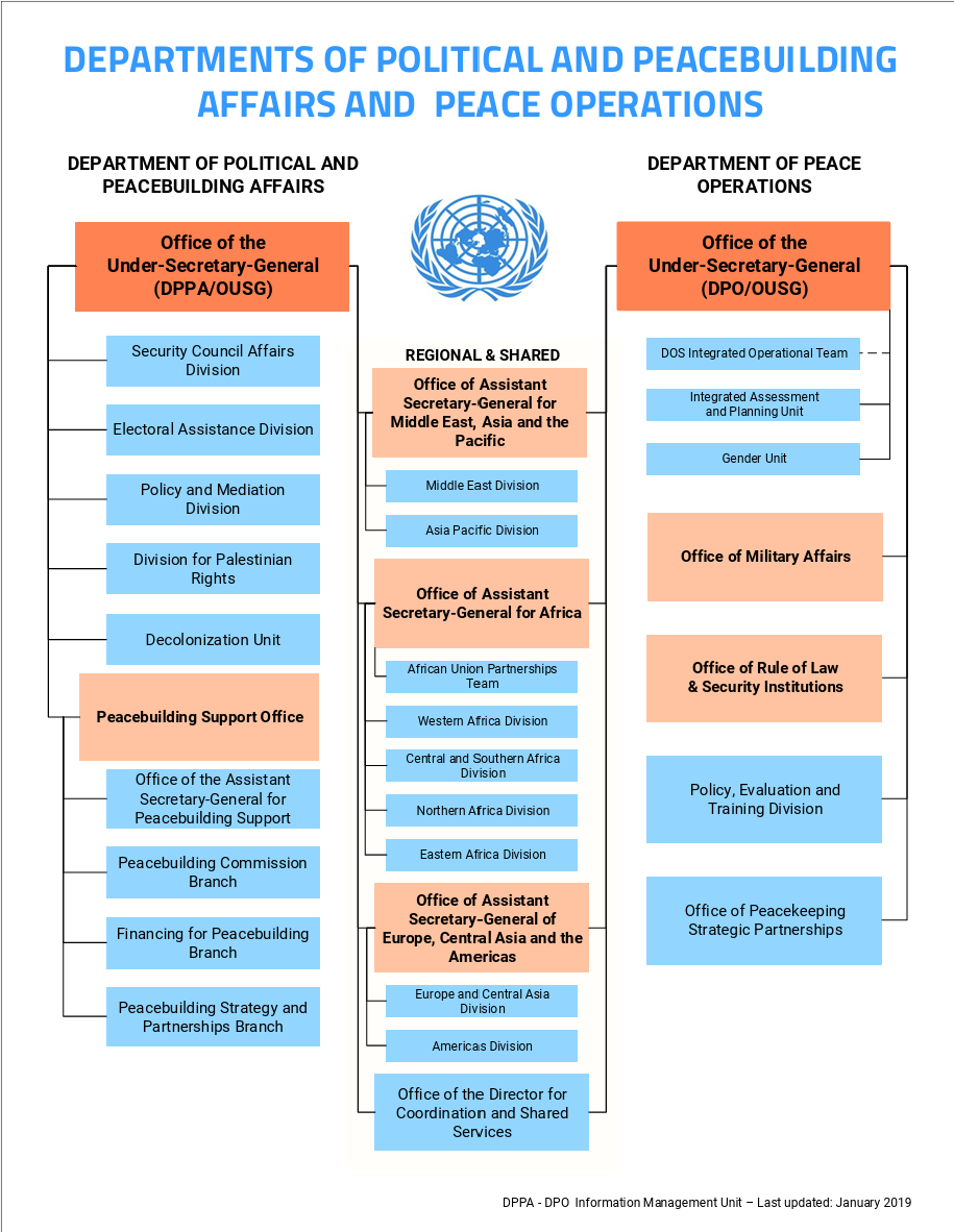 In addition, DPO shares with the Department of Political and Peacebuilding Affairs (DPPA) eight regional divisions that are managed by three Assistant Secretaries-Generals that cover the Americas, Europe, Africa, Asia and the Pacific.