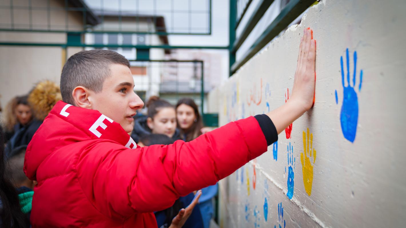 A bilingual language quiz was held and copies of the UNMIK/IOM-supported Albanian-Serbian/Serbian-Albanian dictionary were gifted to the school in recognition of language rights, while youngsters also painted a gender equality-themed mural to simultaneously mark the ongoing 16 Days Of Activism against Gender Based Violence.