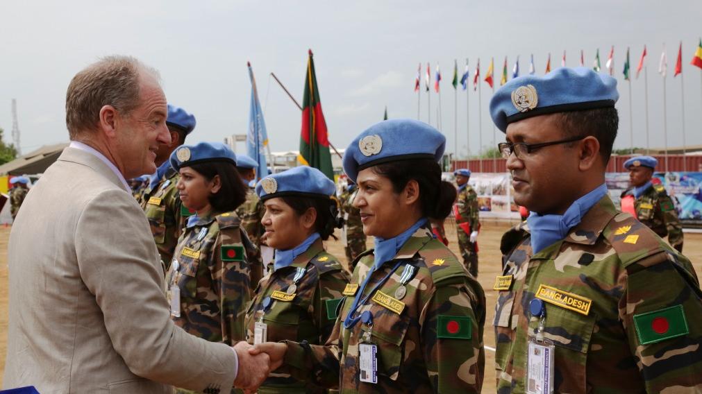 Bangladeshi engineering troops receive their UN medals from the Head of UNMISS, David Shearer.