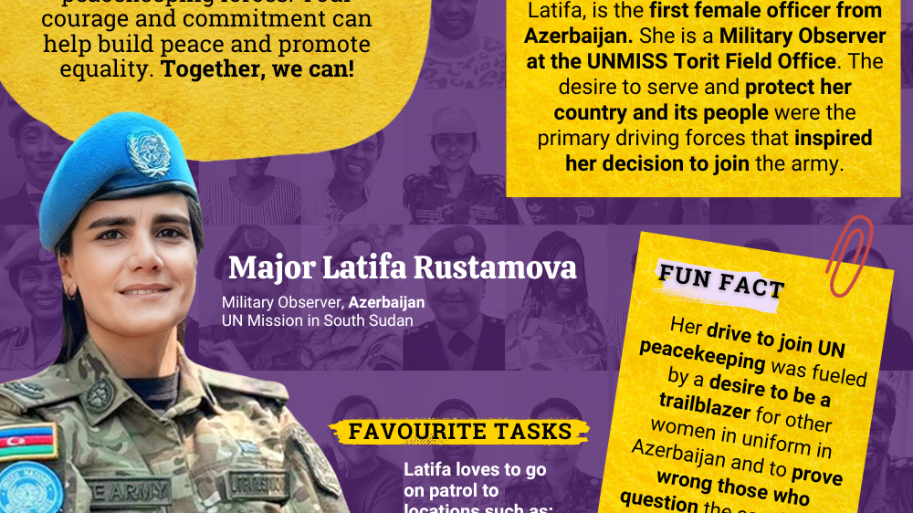 Of the 112 peacekeepers deployed by Azerbaijan to a UN peacekeeping mission since 1991, Major Latifa Rustamova is the first woman. Hailing from the capital Baku, Major Rustamova’s journey from the Azerbaijan Military Academy to the United Nations Mission in South Sudan (UNMISS) not only reflects her personal dedication but also a significant shift in the traditionally male-dominated military service. Major Rustamova arrived in UNMISS in March 2023 as a Military Observer. In this role, she has actively engaged with local communities through regular patrols, supporting the mission’s work to restore peace.