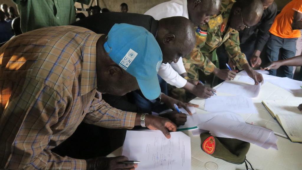 Civilians and military personnel in the village of Owiny-kibul near Magwi sign resolutions to improve strained relations.