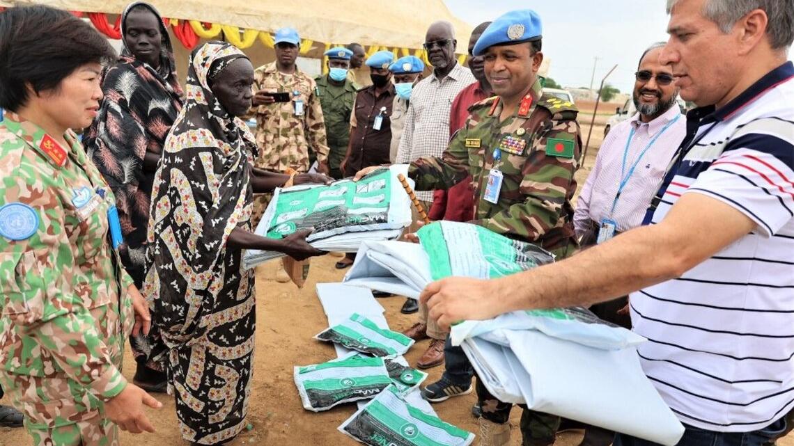 The UNISFA OIC acting HOM/FC, Brig-Gen Abu Syed Bakir, presented 1,200 mosquito nets and 400 plastic sheets to the local administrations on 20 June. The donation, which will benefit the IDPs, was made under the Quick Impact Project. Paramount Chief Bulabek Deng Kuol and other local leaders were present.