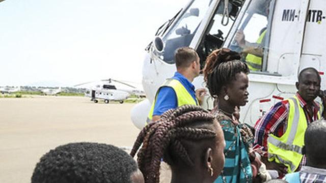 “I had wanted to come home since last year but couldn’t make it,” says one woman as she steps off the helicopter. “Now I thank God that am here in Yuai with my children. I believe that my suffering is finally over.”