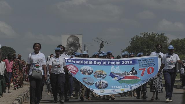 Civil society groups, students, and UN peacekeepers march through the streets of Juba on International Day of Peace, with banners declaring, "Peace is a Human Right"