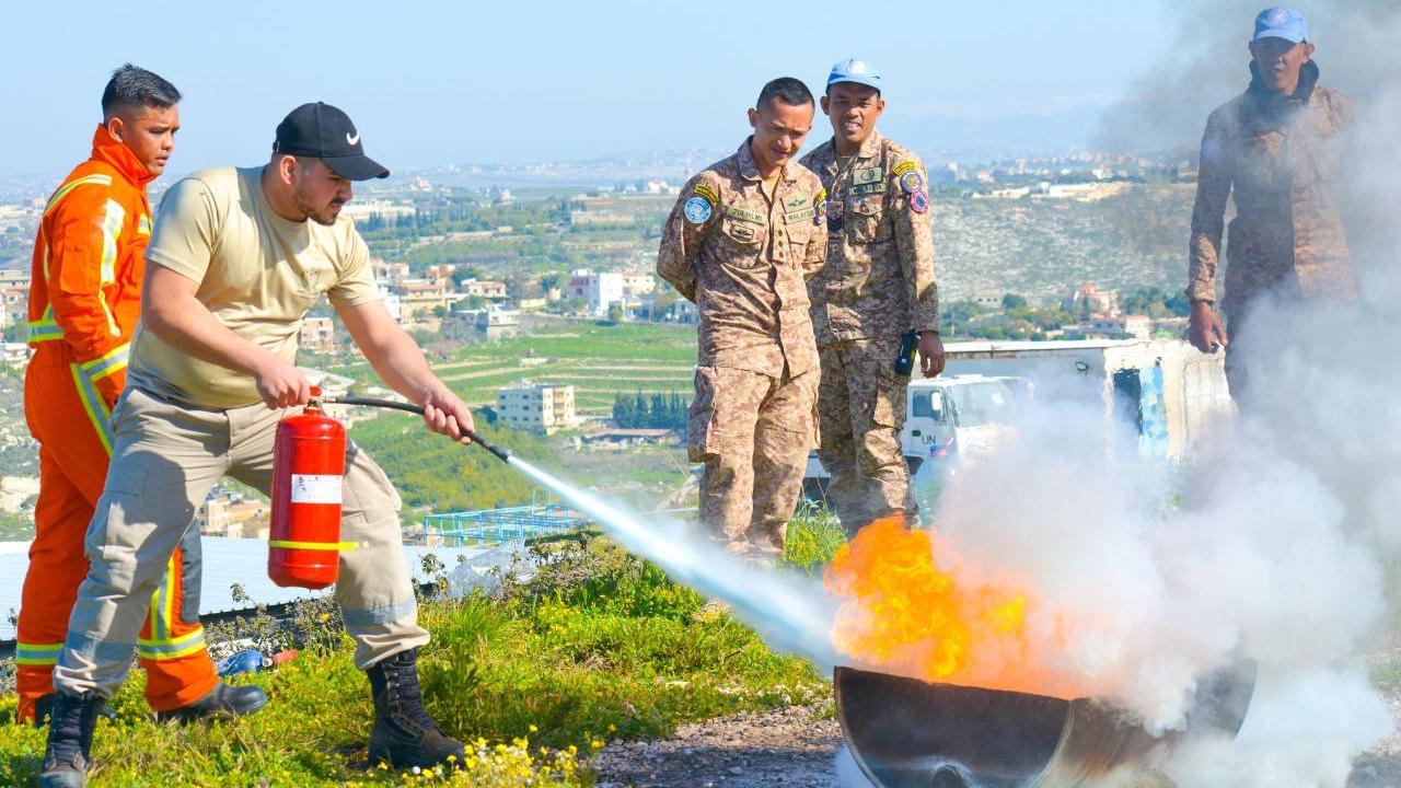 After a theoretical class on firefighting techniques, both UNIFIL peacekeepers and civil defense members tackled real life firefighting situations. The focus was on the different kinds of fires and corresponding extinguishers, given that not all fires are the same.