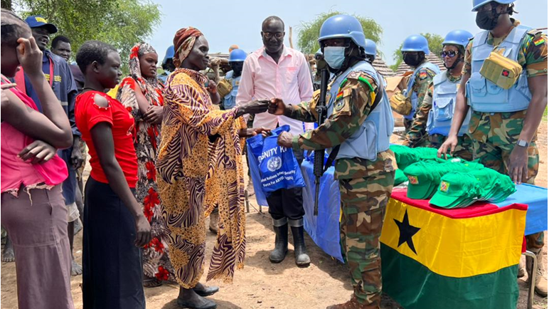 Abyei, 22 August 2022 – The CIMIC Team of the Ghanian Battalion (GHANBATT) led by the Officer Commanding Marial Achak COB, Capt. SO Sarkodie, recently donated some assorted relief items to the Marial Achak Women Association in the Marial Achak Village. The donation, comprising of T-Shirts, flashlights, bathing soaps, some toothpastes, and brushes, as well as packs of washing powder and sanitary pads was made to the group which comprises of young girls from ages 12 to 16 years and elderly women ranging from30 years and above.