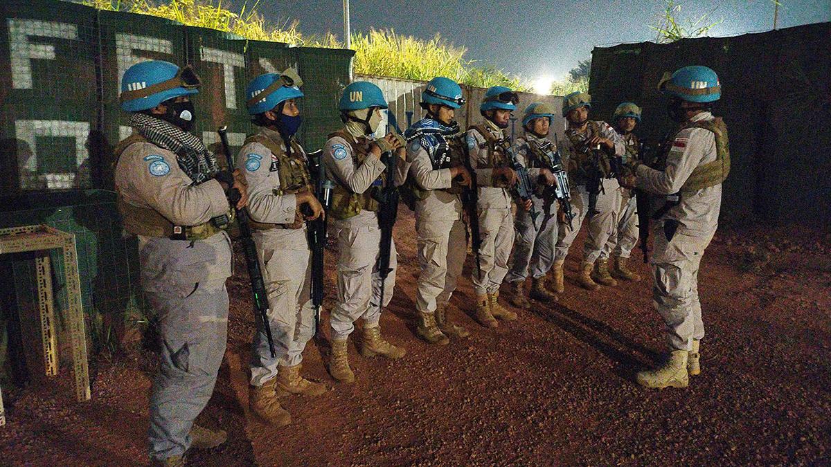 The “Jaga Malam” (night duty in Indonesian Malay) starts at 8:00 pm sharp and the 10 squad members, including two policewomen, get ready: coyote uniform, blue helmet with Indonesian flag, dust goggles. With their first name inscribed on their plate holders, they look like commandos. Aligned, facing their section commander, they raise their weapons, tilting at 90 degrees, they all check the breech, with their left hand, they load their machine gun. One click and they turn around simultaneously. They bow their heads, their hands crossed holding the butt of their assault rifle. The prayer is interreligious, the members of the Muslim confreres service respecting the 24 Christians and 8 Hindus of INDO FPU 2.