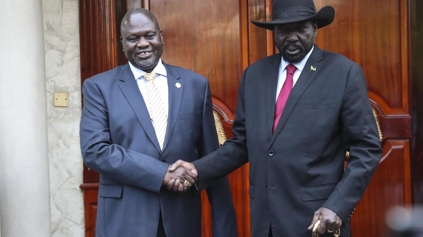 Opposition leader Riek Machar and President Salva Kiir shake hands in Juba for the first time since 31 October last year.