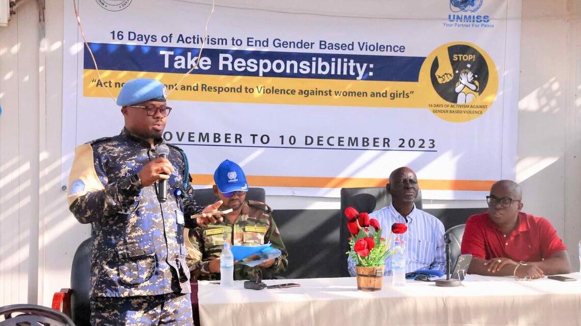 WARRAP - In a compelling display of solidarity, the United Nations Mission in South Sudan (UNMISS) kicked off the 16 Days Activism Against Gender-Based Violence with a dynamic series of events, echoing the collective commitment to eradicate violence against women and girls in Warrap State.The joint commitment emanated from the UN Peacekeeping mission’s Kuajok Field Office and key stakeholders across the State cabinet and partners.Internally, the Mission organized a thought-provoking panel discussion featuring representatives from Ghana, Serbia, South Sudan, and Uganda. Uniformed personnel and civilian peacekeepers shared insights into measures taken to combat sexual and gender-based in their respective countries.“In Uganda, women and girls face many challenges. However, the government and key actors have persistently worked hard to bridge the gap between the legal framework and day-to-day monitoring and reporting mechanisms in the police service. So now, things are changing,” Geoffrey Okello, a United Nations Police (UNPOL) Officer, conveyed during the panel discussion.“I believe South Sudan will get there. Because of our consistent efforts, we can now see more and more women and girls in Warrap are aware of their rights and, most importantly, are fighting for them,” he added.Stating that violence against women and girls is a violation of human rights, Bernard Mugisha, a Human Rights Officer, emphasized that ensuring women are safe is a crucial aspect of protecting civilians.“The imperative to end all forms of violence against women and girls is not just a commitment to human rights; it’s the cornerstone of protection of civilians. By eradicating gender-based violence, we fortify the shield that guards the most vulnerable among us, ensuring a South Sudan where safety knows no gender, and every individual can thrive free from fear,” stated Bernard passionately. The campaign concluded innovatively with football penalty kicks, symbolizing a collective effort to “kick out violence against women and girls” from South Sudan. Participants rallied behind the slogan, emphasizing the urgency of eliminating violence in all spheres of society.The launch event at Kuajok Freedom Square witnessed a powerful convergence of voices and a strong commitment from the State government as state authorities expressed their unwavering commitment to supporting initiatives that combat violence. Agem Akotdit Madut, the Minister of Cabinet Affairs, appealed, “The violence against women and girls must be stopped from now on. We stand with our sisters, daughters, and mothers to create a safer and more equitable society for them to enjoy the same rights as men.”More government officials and partners echoed this sentiment, emphasizing the importance of collaborative action. Rose Anyang, Minister of Gender and Social Welfare, pointed out that currently, the state is at risk of escalating communal violence and insecurity, and it’s crucial for everyone to stand together. “We thank partners for their commitment and support. Warrap State is committed to eradicating SGBV. Through partnerships and events like these, we send a clear message: violence has no place in our communities.”Until December 10, UNMISS is hosting numerous awareness-raising and solidarity-building activities centered on empowering women and girls.