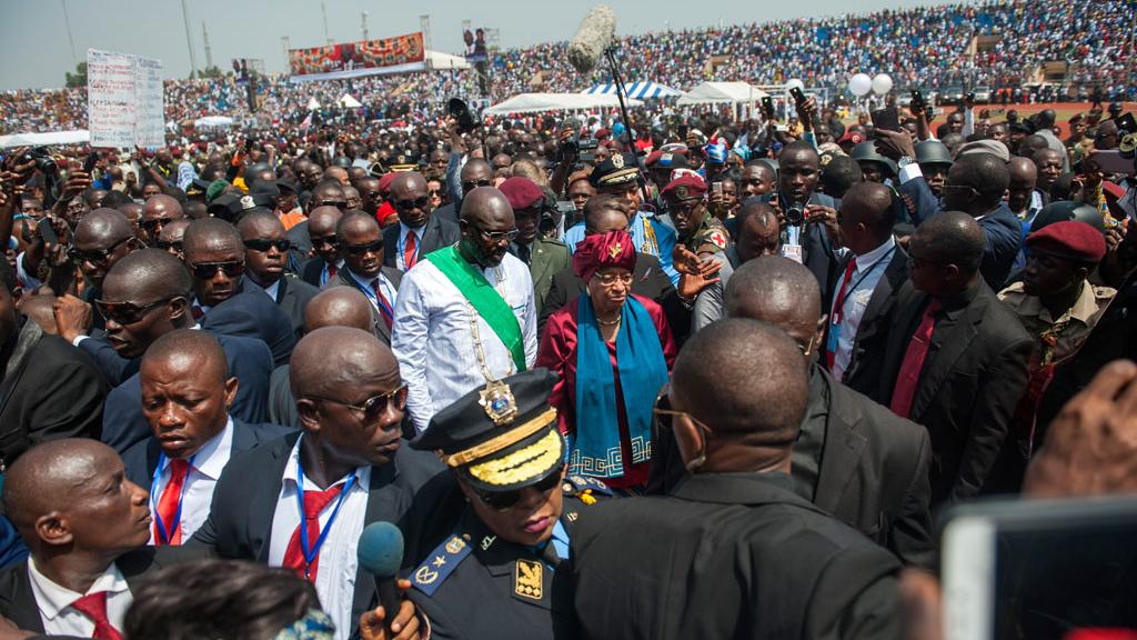 The new Liberian President took office at a ceremony in the packed SKD stadium in the capital, Monrovia.