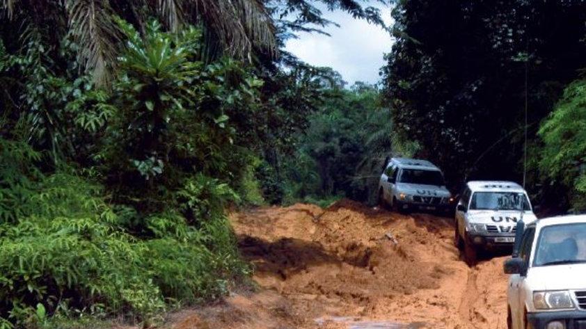 A convoy of UNMIL vehicles travelling the roads in Bopolu,Gbarpolu County during the rainy season. Photo: UNMIL | 25 Sep 07
