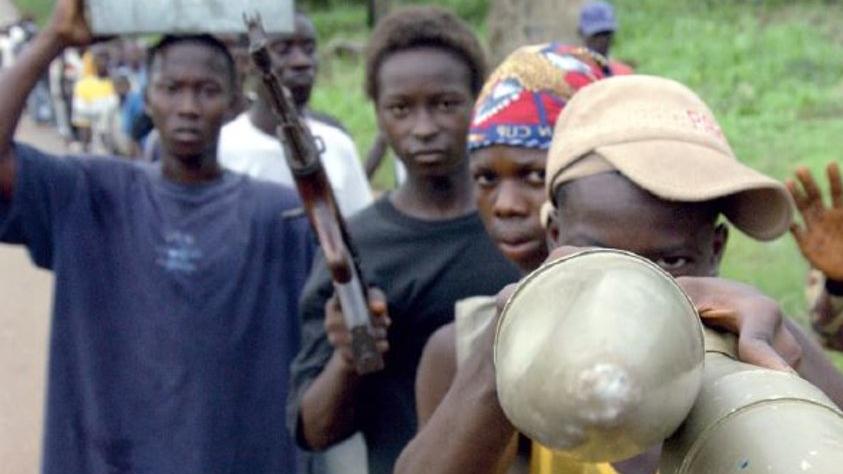 Child soldiers carrying ammunition for disposal at a demobilization event conducted by UNMIL in Tubmanburg, Bomi County. Photo: Eric Kanalstein | UNMIL | 24 Apr 04