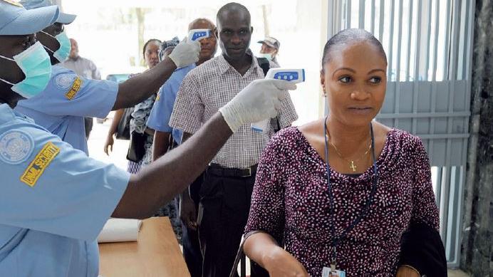 UNMIL Security guards checking the body temperature of UNMIL staff entering the UNMIL Headquarters. Photo: UNMIL