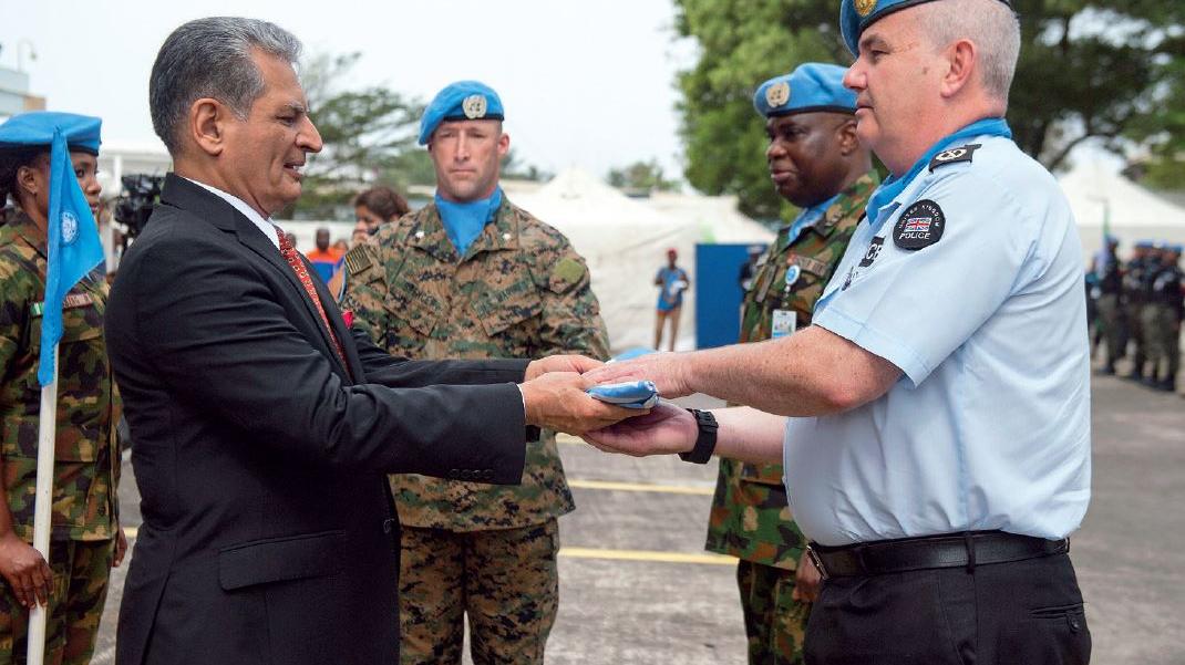 Farid Zarif, the Special Representative of the Secretary-General and Head of UNMIL (left), presents the UN flag to UNMIL Police Commissioner Simon Blatchly at UNMIL HQ during a farewell ceremony to honour uniformed personnel. Photo: Albert G. Farran | UNMIL | 5 Feb 18