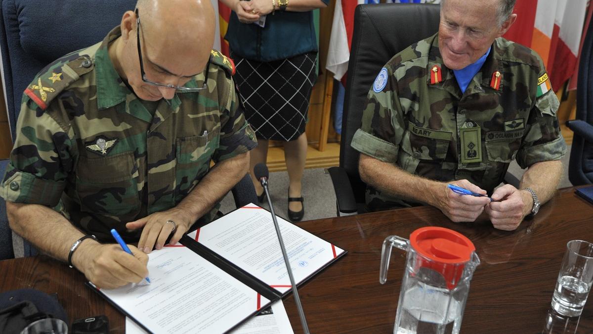 Brigadier General Mohammed Janbay of the Lebanese Armed Forces (LAF) signs a receipt of the equipment donated by UNIFIL.