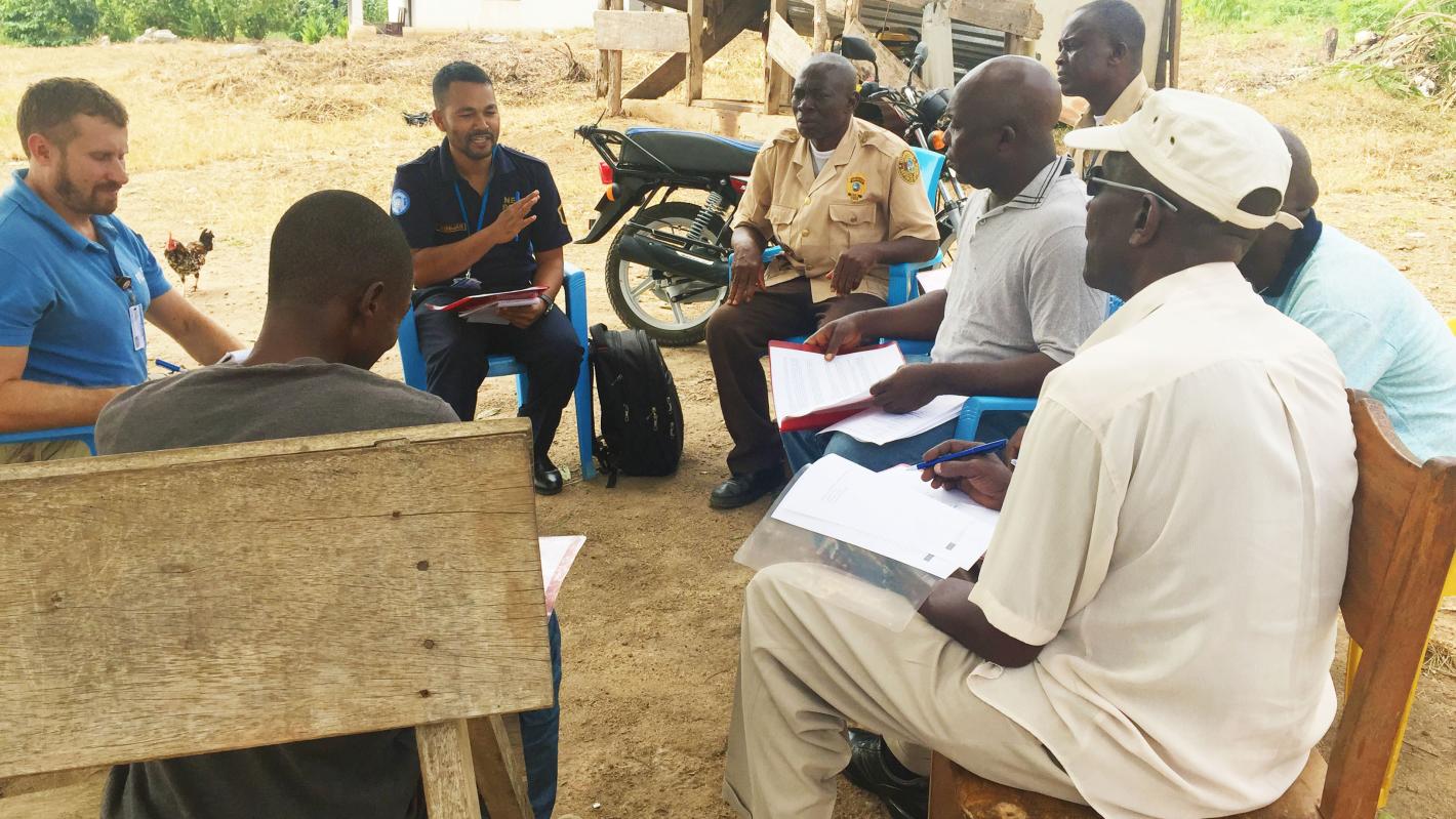 UN Police and LNP discuss with members of the community in Lofa County about community policing and security during electioneering period.