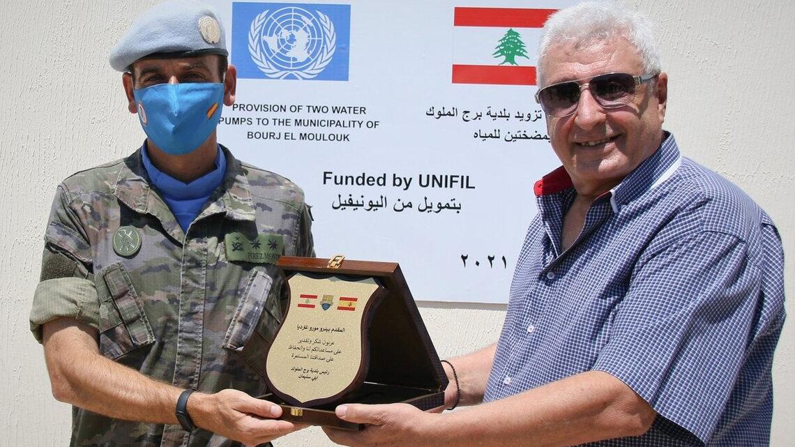 UNIFIL Spanish Battalion Commander Lieutenant Colonel Pérez Montes (left) handed over two water pumps for the local water reservoir to the Mayor of Bourj Al Malouke, Elias Ncoula Seleiman, on 7 July 2021.