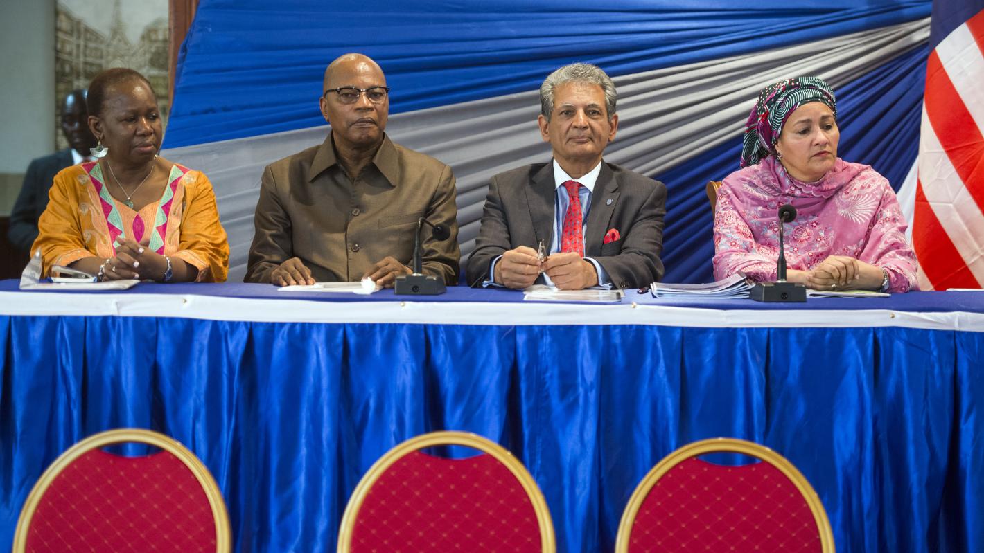 21 March 2018. Monrovia: (Left to right) the Assistant Secretary-General for Peacekeeping Operations, Bintou Keita, the Special Representative and Head of the United Nations Office for West Africa and the Sahel (UNOWAS), Mohammed Ibn Chambas, the Special Representative of the Secretary-General and Head of UNMIL, Farid Zarif, and the United Nations Deputy Secretary General, Amina J. Mohammed, attend the closing ceremony of National Reconciliation Conference at the City Hall in Monrovia, Liberia. Amina J. Mohammed is visiting the country to attend the celebrations of the completion of the UNMIL Mandate. Photo by Albert Gonzalez Farran - UNMIL