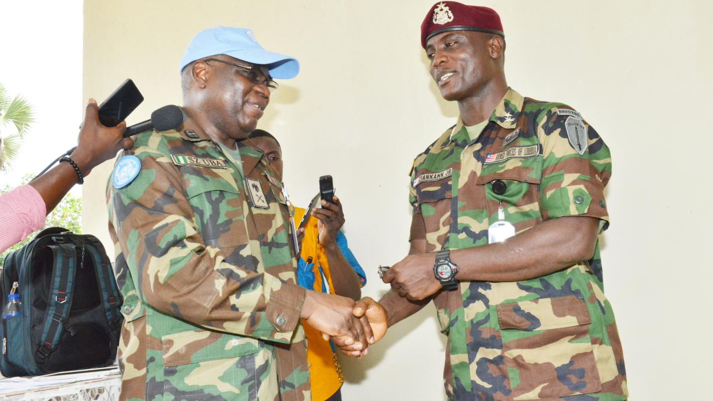 UNMIL Force Commander Maj Gen Salihu Zaway Uba (left) hands over keys of the four renovated blocks of the Liberian Coast Guard in Buchanan to AFL Chief of Staff, Daniel Dee Ziankahn.
