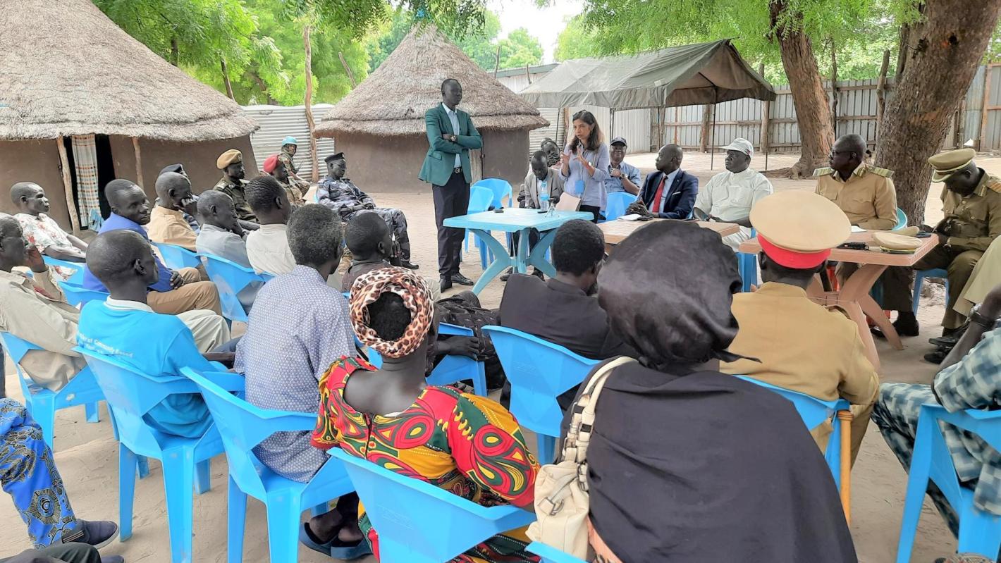 JONGLEI – In response to a flood alert for the Upper Nile region, including the five counties of Jonglei State, the United Nations Mission in South Sudan (UNMISS) and the Jonglei Government met with the Duk County community to raise public awareness and to discuss how to minimize the risk of flash floods this year.“We urge the government and humanitarian partners to provide aid in addressing the social challenges arising from the consequences of climate changes,” explained Paramount Chief Deng Mabur.Community members, along with local authorities, youths, and women's representatives, passionately voiced their concerns to a delegation headed by Geetha Pious, Head of the peacekeeping mission’s Field Office in Bor.With large parts of Duk County facing the imminent threat of inundation, priorities include safeguarding the airstrip, constructing dykes, and prepositioning vital supplies such as light shelter construction materials. Providing medication for malaria and snake bites, they have decided, will also be important.“The huge task of constructing dykes falls primarily under the jurisdiction of the government and humanitarian agencies in Jonglei. However, as UNMISS, we are committed to providing support where and when feasible. Our main objective is to establish conflict prevention measures at relocation points [in areas deemed less vulnerable to floods) through awareness campaigns,” said Ms. Pious.The state authorities were thankful for the logistical support and assistance provided by UNMISS in Duk County.“We have now completed the first mission, to visit the counties, of the Jonglei High Committee on flood management. We have carefully noted the people's concerns, a comprehensive action plan is currently being drafted and resources have been set aside for flood mitigation measures,” declared James Mawich Makuach, Deputy Chairperson of the Committee.