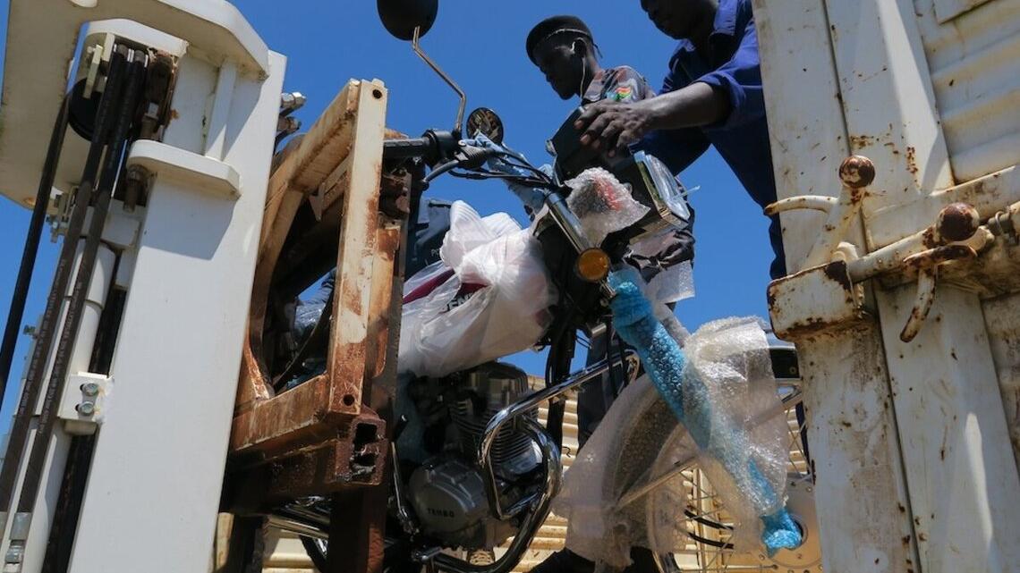 This motorbike, still wrapped in plastic, and nine others will help police in Jonglei do a better job.