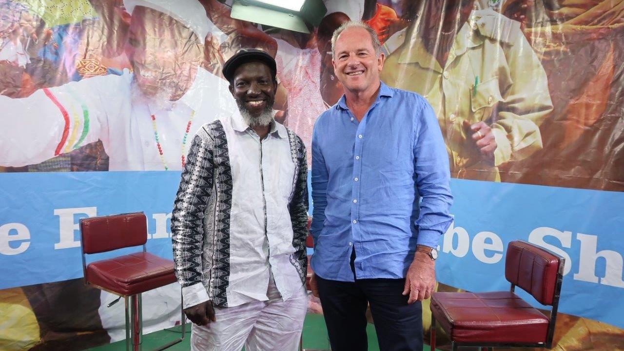 Head of UNMISS, David Shearer (right), with legendary South Sudanese musician, Emmanuel Kembe at the SSBC studios in Juba. Photo: Moses Pasi/UNMISS