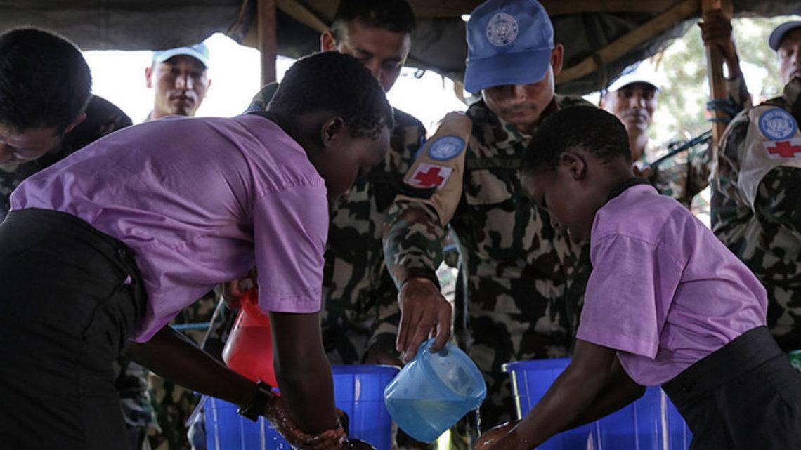 At a school in Juba, hundreds of pupils gather together, curiously listening and mimicking the actions of Nepalese military medics, as they demonstrate proper hand-washing and hygiene techniques.