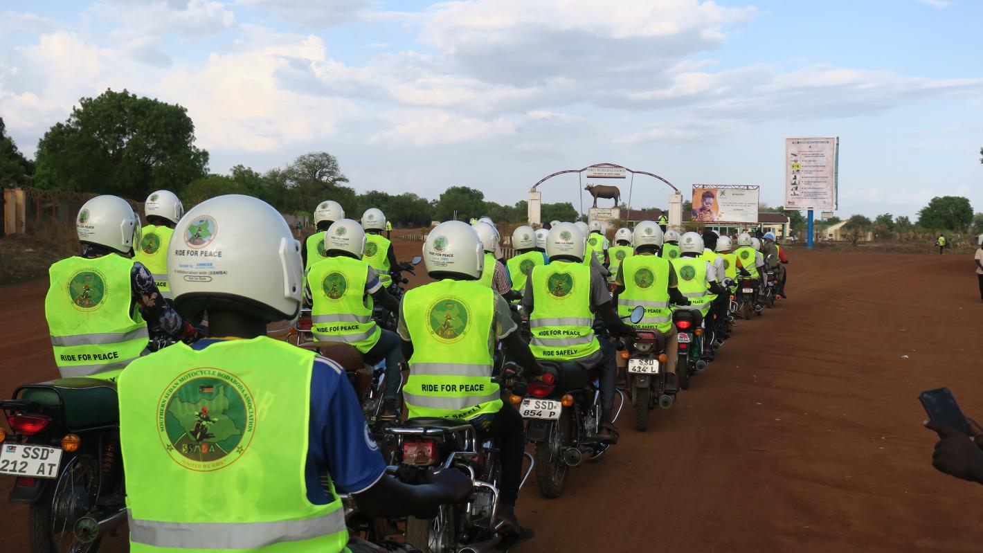 Boda bodas or motorcycle taxis are a common mode of public transport across South Sudan. The UNMISS Field Office in Eastern Equatoria, in a bid to promote road safety, recently handed over helmets and refkective jackets to some 45 commercial cyclists.