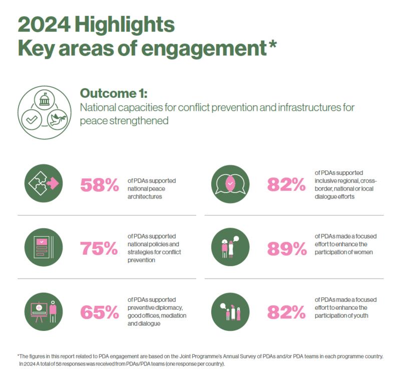 Beyond the deployment of PDAs, the Joint Programme also facilitates deployment of short-term expertise to respond and engage in crisis settings, provides coordinated and complementary UNDP and DPPA support, analysis, and engagement in target countries, and builds on the expert knowledge of its stakeholders to share good practices, lessons learned, and engage in a community of practice. Aiming to serve as a platform that brings together various UN tools and approaches, the Joint UNDP-DPPA Programme contributes to coherent UN engagement by working in partnership with other UN entities, such as the Peacebuilding Support Office (PBSO), UN Volunteers (UNV) and UN Women.