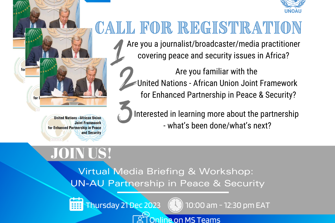 20 December 2023UNOAUINVITATION: Virtual Media Briefing & Workshop on the Joint UN-AU Partnership in Peace and Security