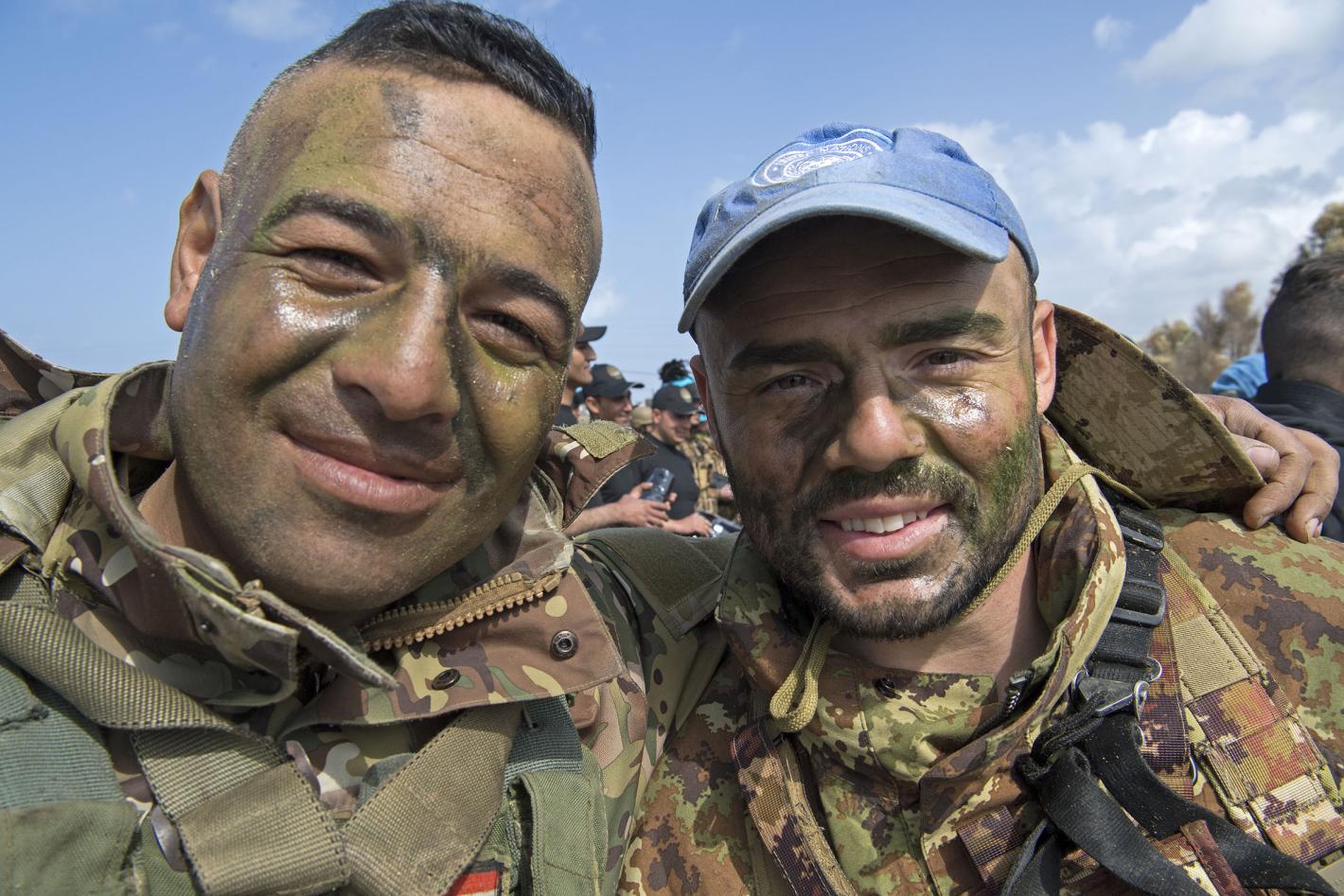 A LAF soldier and a UNIFIL peacekeeper after completing the month-long joint training. The soldiers from the Lebanese Army crouch behind a burnt-out car. Smoke flares diminish the visibility and the sound of gunfire is…