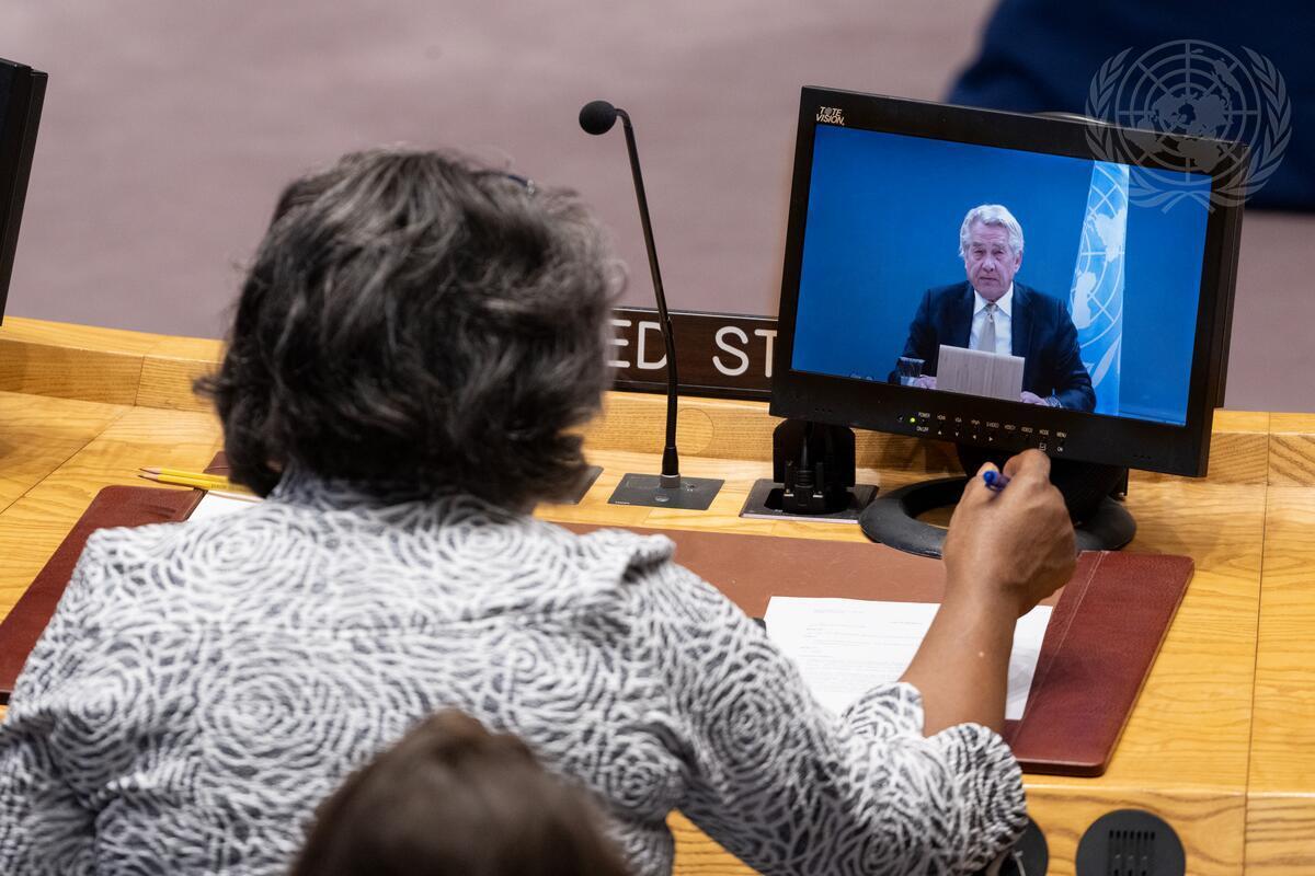 Tor Wennesland (on screen), Special Coordinator for the Middle East Peace Process, briefs the Security Council meeting on the situation in the Middle East, including the Palestinian question. Seated at the table is Linda Thomas-Greenfield, Permanent Representative of the United States to the United Nations. (UN Photo/Eskinder Debebe - 29 November 20230