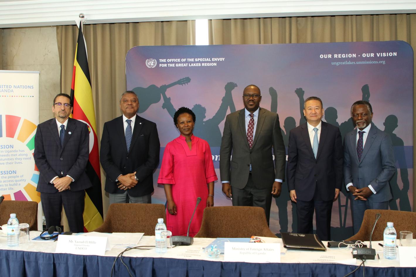 Left to right: Bruno Lemarquis, (left) Deputy Special Representative to the UN Stabilization Mission in the DRC (MONUSCO), Yacoub El Hillo, (2nd left), Regional Director for the Development Coordination Office for Africa, Susan Ngongi Namondo, UN Resident Coordinator in Uganda, Bagiire Vincent Waiswa, Permanent Secretary, Ministry of Foreign Affairs of the Republic of Uganda, Huang Xia, UN Special Envoy for the Great Lakes region (2nd right), and Parfait Onanga-Anyanga, (right), Special Representative of Secretary-General to the AU and Head of the UN Office to the AU (UNOAU), during the second SPG Retreat held in Kampala, Uganda. Photo (William Sila, Office of the Special Envoy for the Great Lakes region).