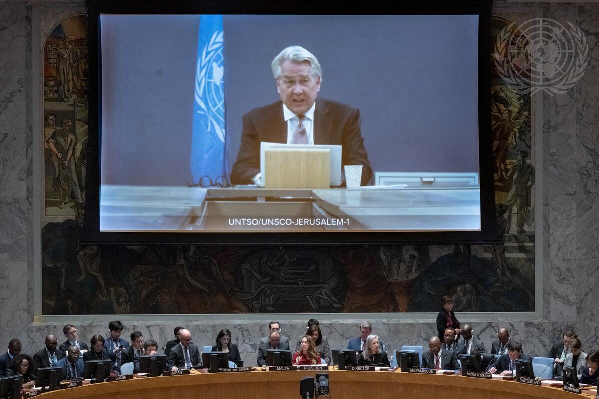 United Nations Special Coordinator for the Middle East Peace Process, Tor Wennesland (on screen) briefs the Security Council on the Situation in the Middle East. (UN Photo/Eskinder Debebe - 20 February 2023)