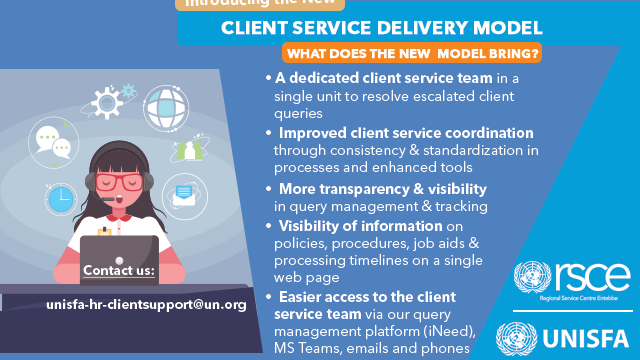 On 19 May 2021, the United Nations Interim Security Force in Abyei (UNISFA) and the Regional Service Centre in Entebbe (RSCE), launched the Client Service Delivery Model (CSDM).The launch was done virtually because of the prevailing COVID19 global pandemic.