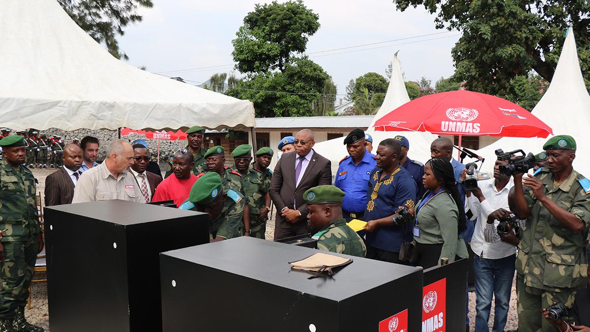 The United Nations Mine Action Service (UNMAS) officially equipped the Congolese National Force units of the 34th Military Region with weapon safes in Goma, North Kivu province. The official handover ceremony took place at the headquarters of the 34th Military Region, in the presence of the Vice-Governor of North-Kivu. This achievement contributes to the overall goal of promoting effective weapons and ammunition management (WAM) in the DRC. UNMAS aims at installing 144 weapon safes in Congolese Armed Forces (FARDC) offices in North Kivu, thereby creating the capacity for securing 1,440 weapons.