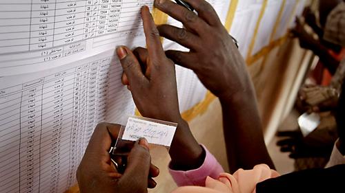 3 May 2011 – Assia Osman looked closely at the voter register pinned up on a notice board at Tilou polling centre, just outside Kadugli town.