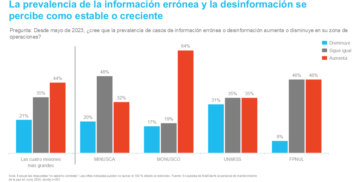 ¿Cómo se percibe este reto en las fuerzas de mantenimiento de la paz?En 2024, una encuesta interna al personal de mantenimiento de la paz reveló que la información perjudicial sigue siendo una amenaza importante para las operaciones de paz. Casi todas las misiones percibieron que la cantidad de información errónea o desinformación iba en aumento en sus zonas de operaciones. Cuando se les preguntó por la propagación de información errónea y desinformación, el 44 % del personal encuestado de las cuatro misiones más grandes observó un aumento de la prevalencia de información errónea o desinformación.