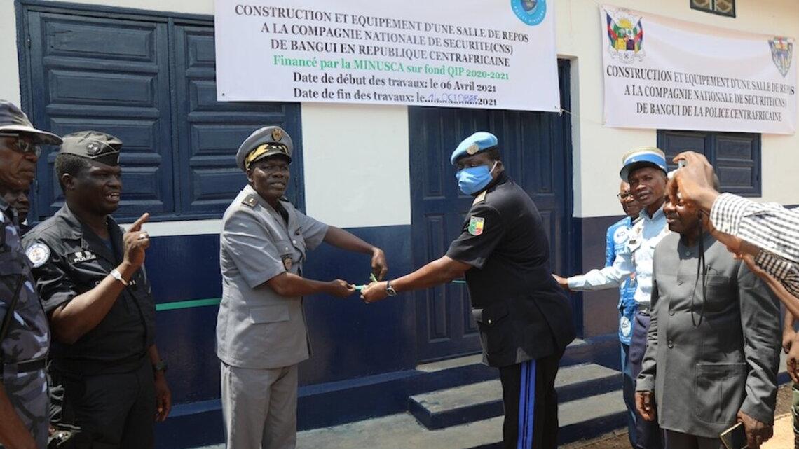 La Compagnie nationale de sécurité (CNS) et l’état-major de la Gendarmerie nationale centrafricaine au camp IZAMO inaugurent respectivement une salle de repos entièrement équipée et un forage d’eau potable. La remise officielle de ces deux joyaux a été faite, le 14 octobre 2021, par le chef du pilier développement de la police de la MINUSCA, le Contrôleur général Mohamed Prince Aledji, représentant du Chef de la police des Nations Unies.
