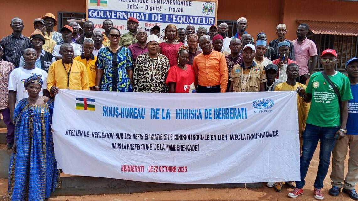 La MINUSCA, en collaboration avec les directions régionales de l’élevage et de l’agriculture, a organisé le 24 octobre 2025 à Berberati, dans la préfecture de la Mambere-Kadeï, un atelier de réflexion sur la cohésion sociale et la transhumance. L’activité a rassemblé les autorités locales, des représentants d’éleveurs et d’agriculteurs, des leaders communautaires ainsi que des partenaires techniques. Les travaux se sont déroulés sous la présidence du Gouverneur Honoré Kinda.