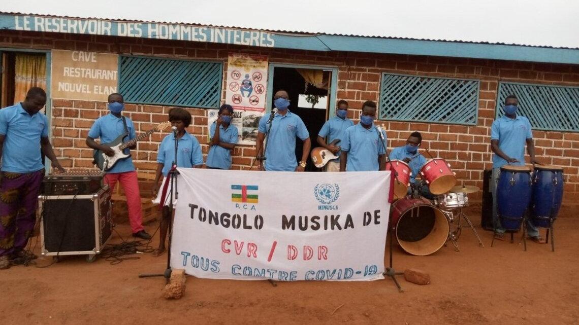Dans le cadre de sensibilisation populaire sur les mesures et gestes utiles contre la propagation du COVID-19 en République centrafricaine, le groupe musical ‘’Tongolo Musika’’ de Bria apporte sa contribution aux efforts des autorités nationales. Composé de 21 membres, dont 6 femmes, tous bénéficiaires de la 3ème phase du Programme de réduction de la violence communautaire (CVR) de la section Désarmement-Démobilisation-Réintégration (DDR) de la MINUSCA ayant opté pour le projet artistique, ce groupe a compris que la lutte contre la pandémie est la responsabilité de tous. Et c’est à juste titre que ces jeunes ont voulu mettre leur popularité au service de la cause.