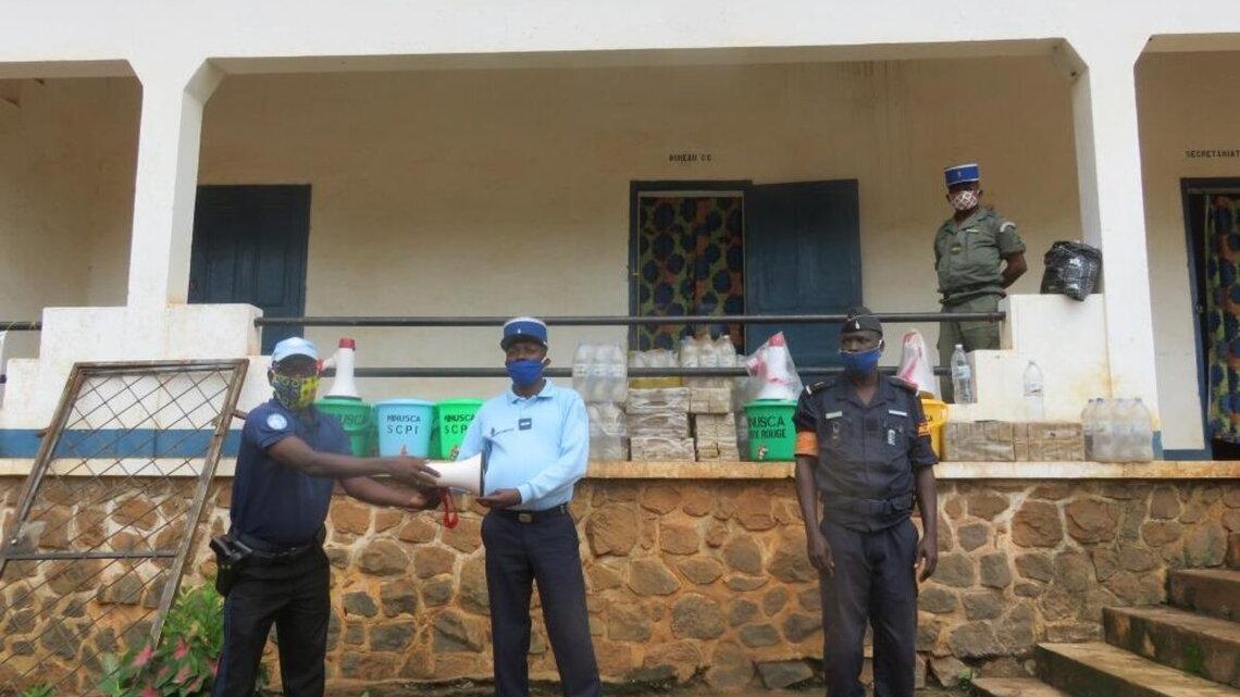 La MINUSCA, à travers sa Division de la Communication stratégique et de l'information publique (SCPI), a procédé, le mardi 30 juin 2020 à Bossangoa, à la remise de kits (savons de linge, palettes d’eau, masques, mégaphones et seaux ) aux Forces de sécurité intérieure de Centrafrique (FSI). Un appui qui s’inscrit dans le cadre de la sensibilisation contre la pandémie de COVID-19.