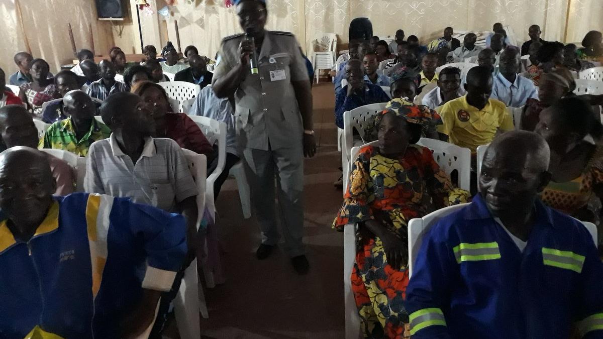 La salle de spectacle de l’hôtel de ville a servi de cadre pour cette rencontre avec plus de cent soixante (160) participants composés du personnel de la mairie, les élus locaux les représentants des confessions religieuses, les notables les membres de la société civile, les associations de femmes, les conducteurs de taxis, des artisans et les agents de la PNC servant dans la commune.