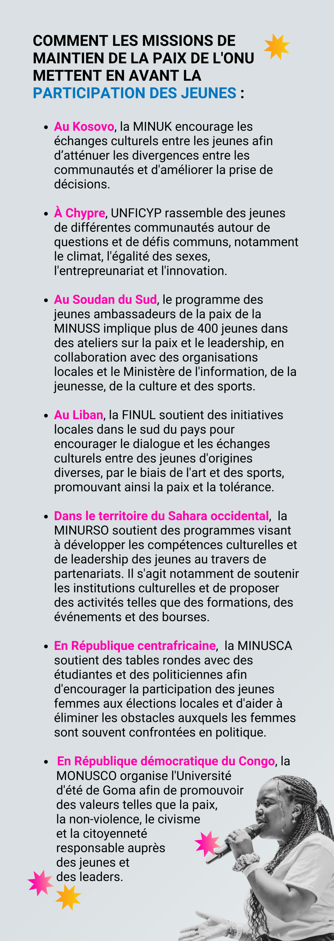 Depuis près de dix ans, les opérations de maintien de la paix des Nations Unies ont activement intégré le point de vue des jeunes dans la prévention et la résolution des conflits. En 2015, la résolution 2250 du Conseil de sécurité de l'ONU a officiellement reconnu et institutionnalisé la contribution des jeunes à la consolidation de la paix, en établissant un cadre axé sur cinq piliers fondamentaux : la participation, la protection, la prévention, les partenariats, ainsi que le désengagement et la réintégration.