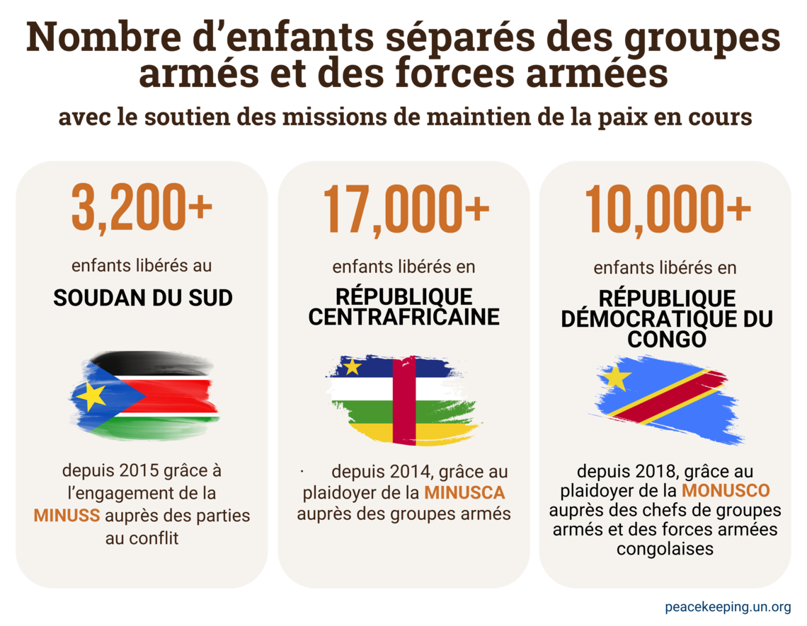 On estime que 250 000 enfants sont toujours associés aux forces et groupes armés dans le monde, selon l’organisation Red Hand Day (Journé Main Rouge), qui fait de la sensibilisation à ce problème. Trois missions de maintien de la paix – la MINUSS, la MONUSCO et la MINUSCA – travaillent actuellement avec des partenaires pour réduire ces chiffres, et leur travail a un impact :