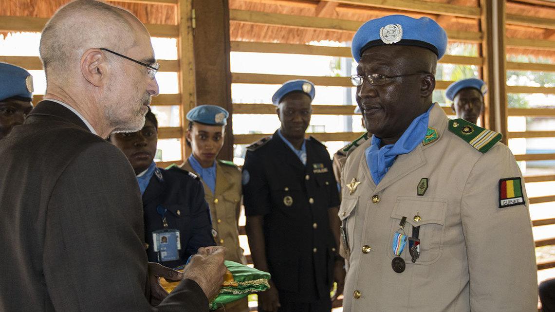 La base logistique de la MINUSCA, à Bangui, a servi de cadre, le 26 juillet à la décoration en l’honneur de huit officiers individuels de la police des Nations Unies (UNPol) guinéens de la MINUSCA. C’était en présence du Représentant spécial adjoint du Secrétaire général des Nations Unies en charge des affaires politiques et de la protection des civils, Kenneth Gluck, du chef par intérim de la composante police de la MINUSCA, le Colonel Ossama El Moghazi, du commandant de la Force, le Général Balla Keita, entre autres personnalités.