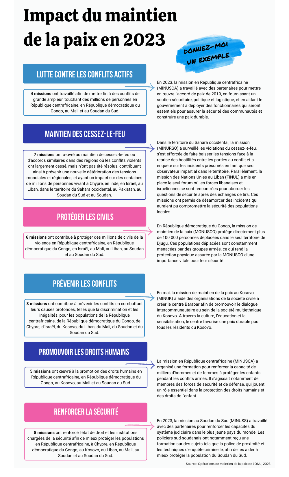 C’est dans ce contexte qu’en 2023, 88 000 Casques bleus provenant de 125 pays ont servi dans 12 missions à travers le monde dans le but commun de protéger et de faire progresser la paix pour des millions de personnes. Ils ont contribué à soutenir des solutions politiques aux conflits, à appuyer les cessez-le-feu, à protéger les civils contre la violence, à protéger les droits humains et à renforcer les capacités des États dans des domaines clés, qui aideront ceux-ci à maintenir la sécurité sans le soutien de l’ONU. Ils ont également assumé des tâches telles que le soutien aux humanitaires pour l’acheminement de l’aide aux communautés dans le besoin, l’observation et le suivi, ainsi que l'enlèvement des restes explosifs de guerre afin de faire face aux menaces immédiates pesant sur les populations. Cinquante-neuf de ces Casques bleus ont donné leur vie au service de la paix.