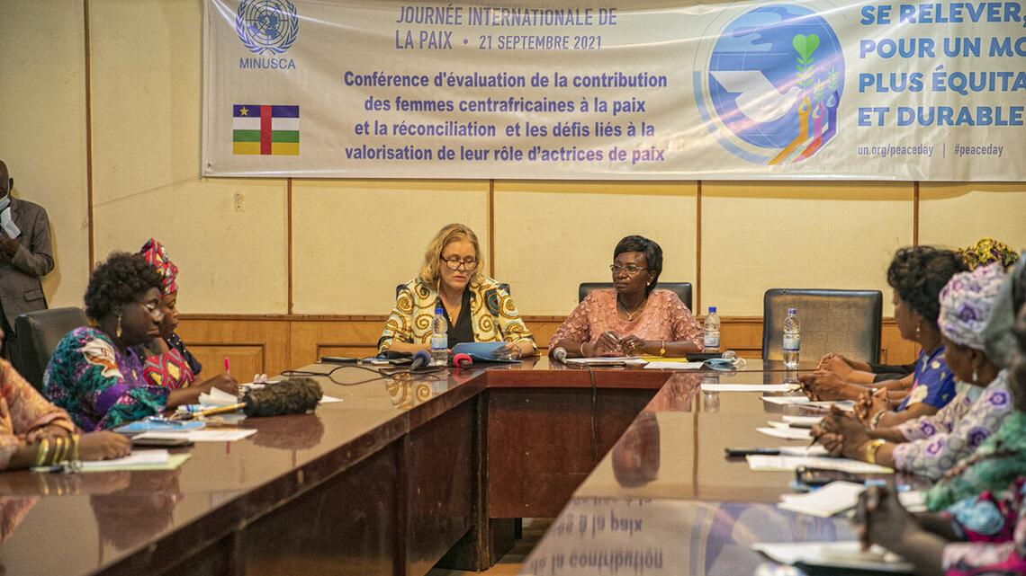 A l’invitation de la MINUSCA à travers sa section Genre, les femmes leaders de Centrafrique ont pris part à une conférence-débat organisée à l’occasion de la Journée Internationale de la Paix (JIP) et présidée par la ministre de la Promotion du Genre, de la protection de la femme, de la famille et de l’enfant, Marguerite Ramadan avec à ses côtés la Représentante spéciale adjointe du Secrétaire général des Nations unies en RCA.